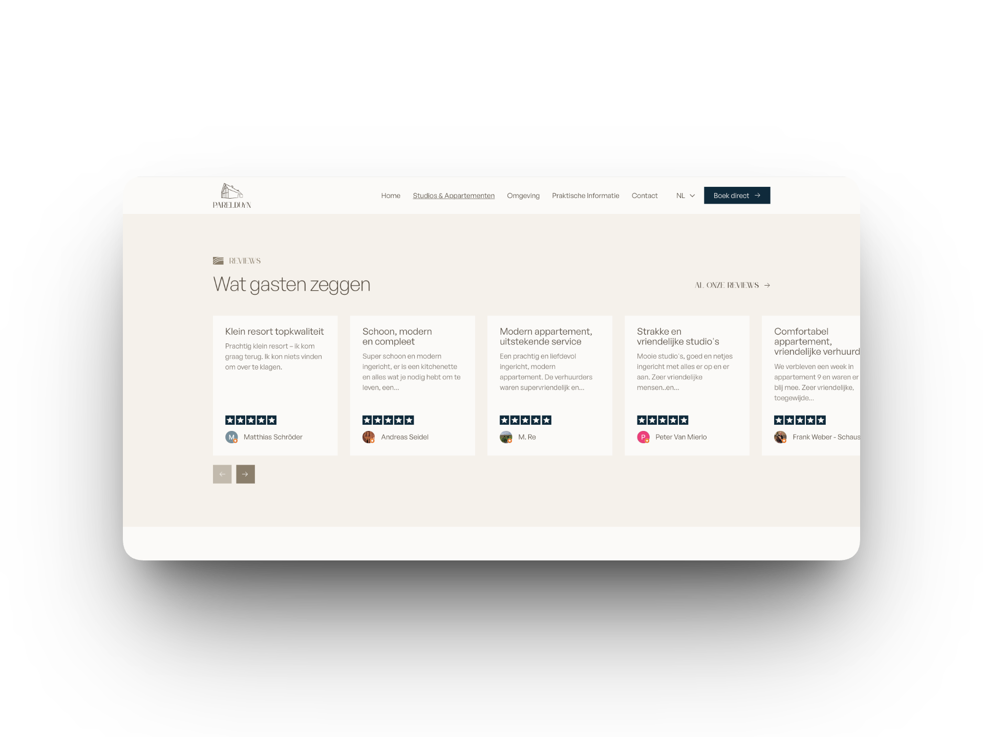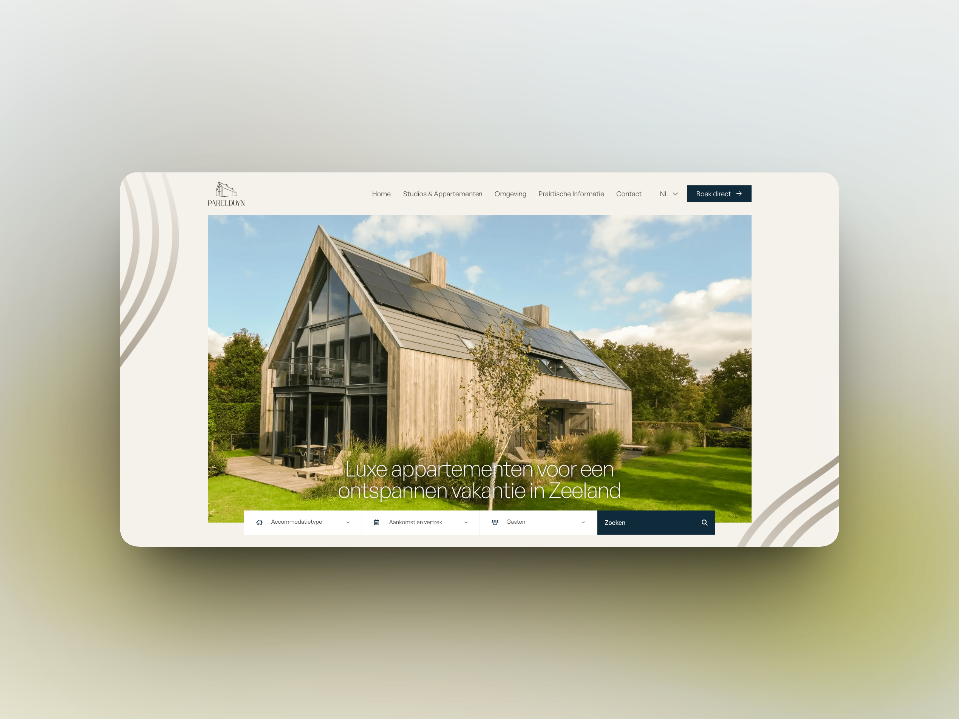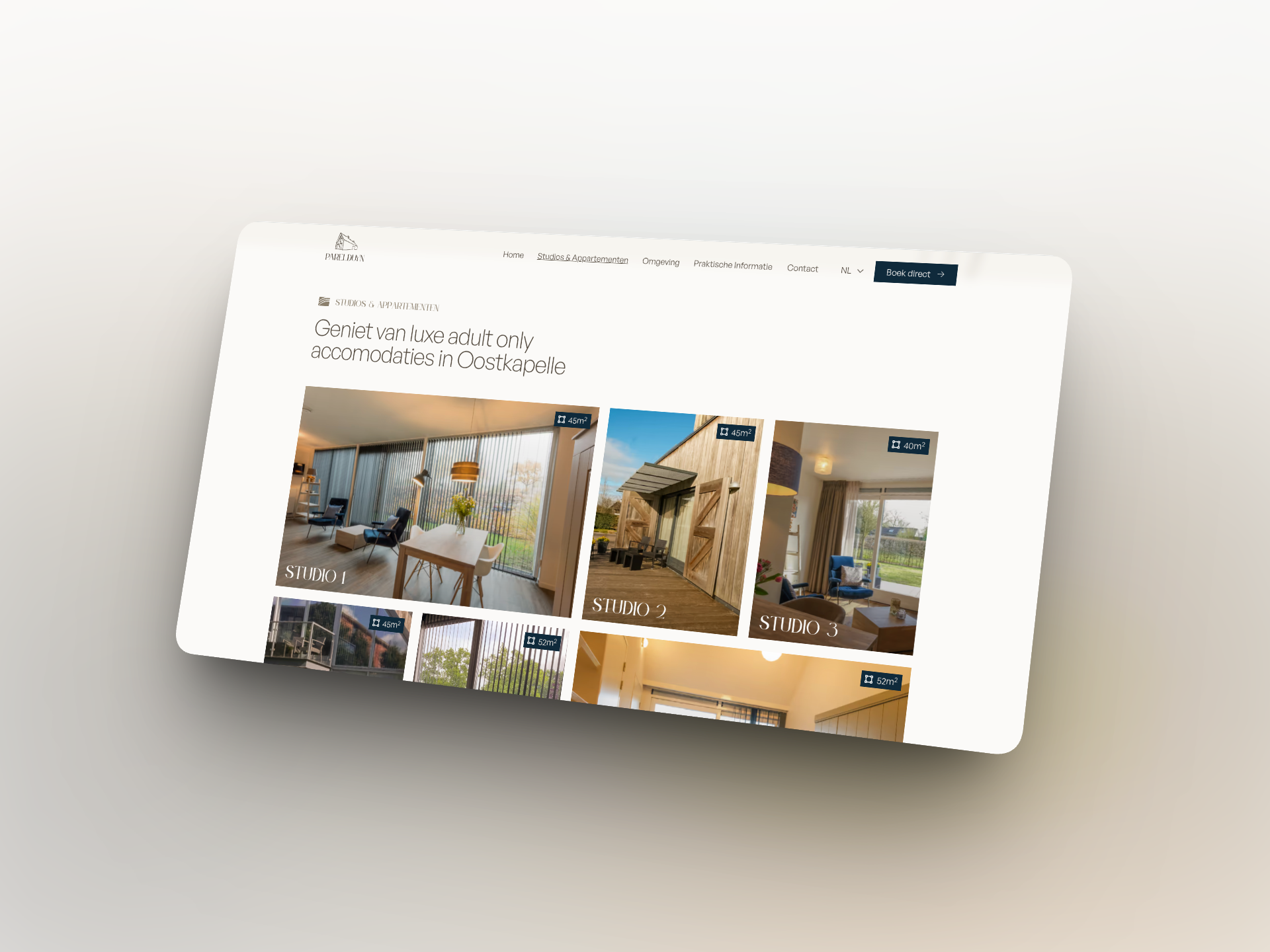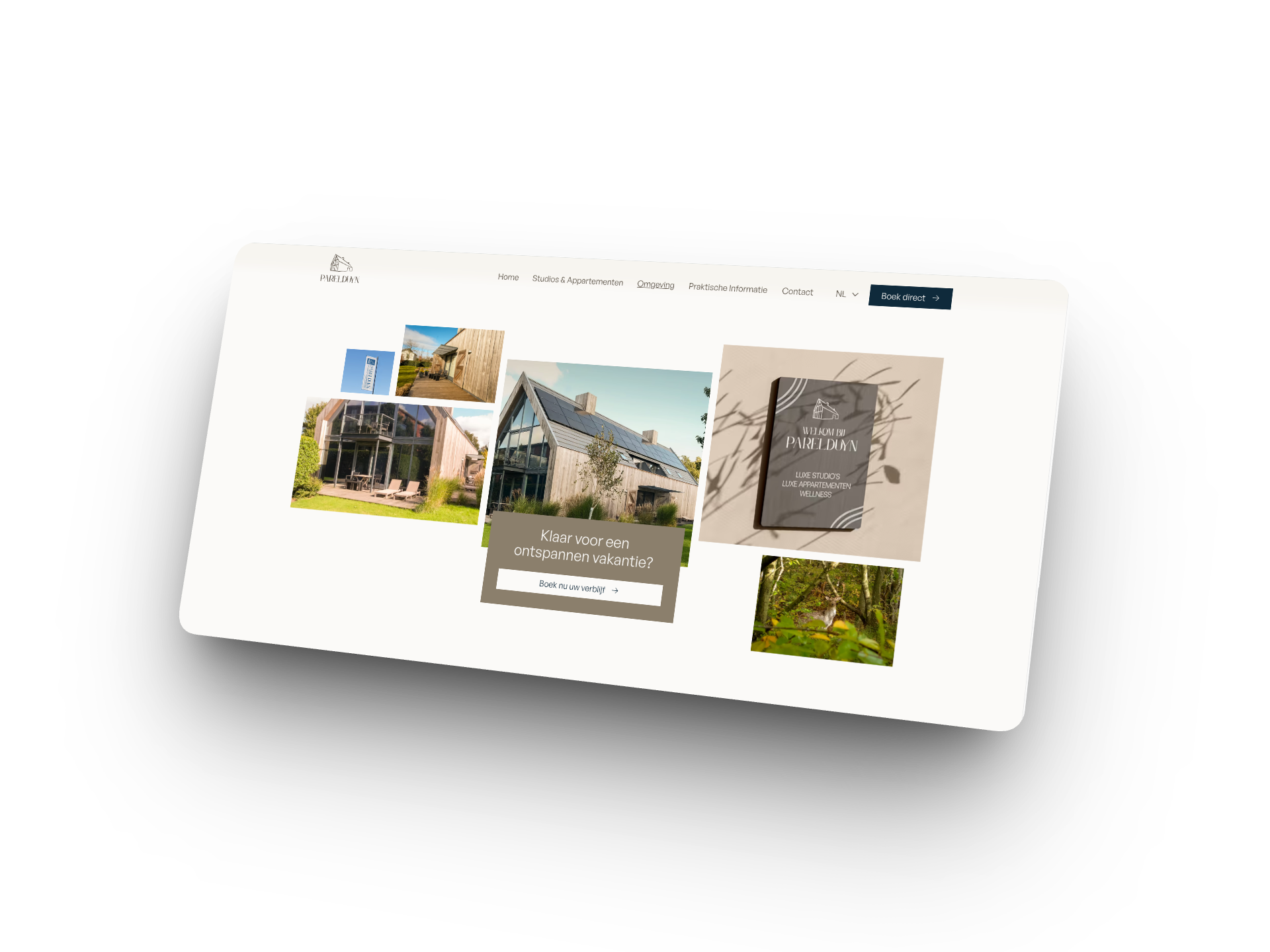 Met de nieuwe branding als fundament bouwden we een website die rust, sfeer en overzicht combineert. De visuele taal die eerder in de huisstijl was neergezet, vertaalden we door naar elke pagina: van de accommodatieoverzichten tot de boekingsflow. Warme beeldtaal, heldere structuur en een vriendelijke tone of voice zorgen ervoor dat de website aanvoelt als een digitale voordeur van ParelDuyn.