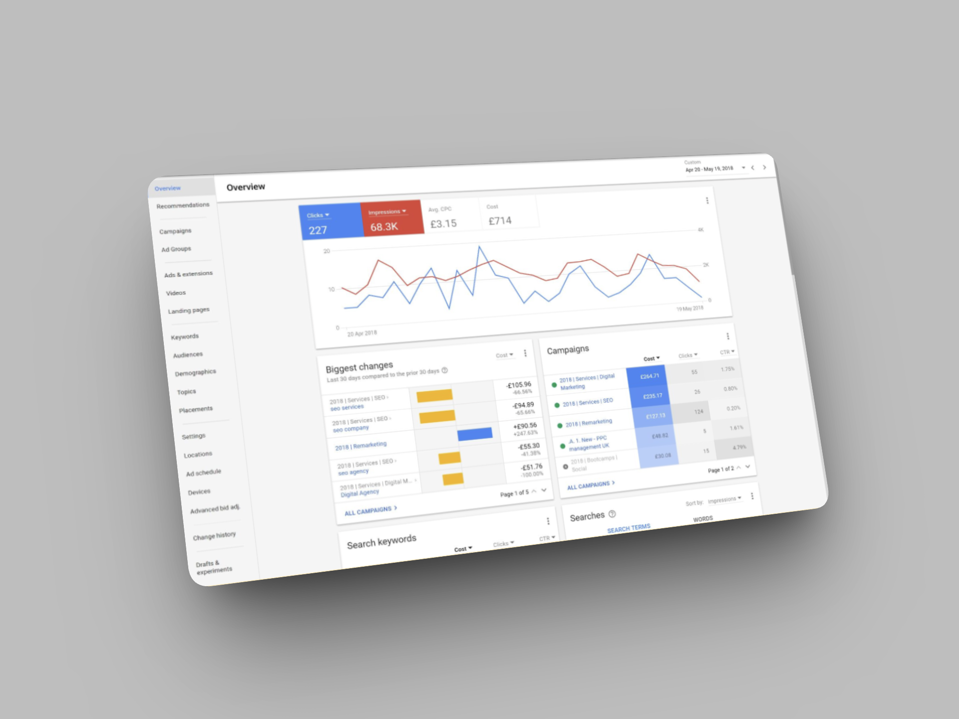Wij werken continu met data uit Google Analytics, zoekwoordenonderzoek en performance dashboards om jouw Google Ads account te verbeteren. Dit zorgt voor lagere kosten per klik, hogere conversies en schaalbare groei.